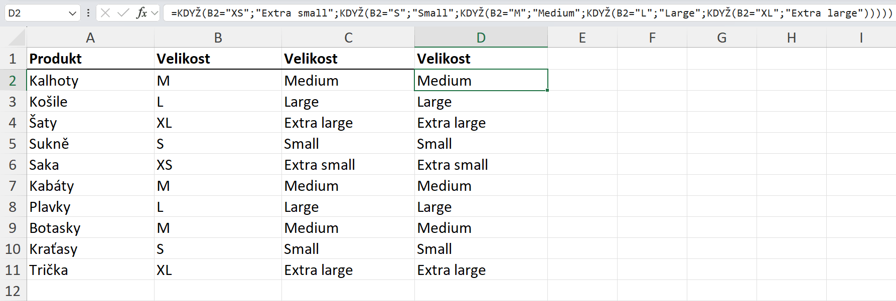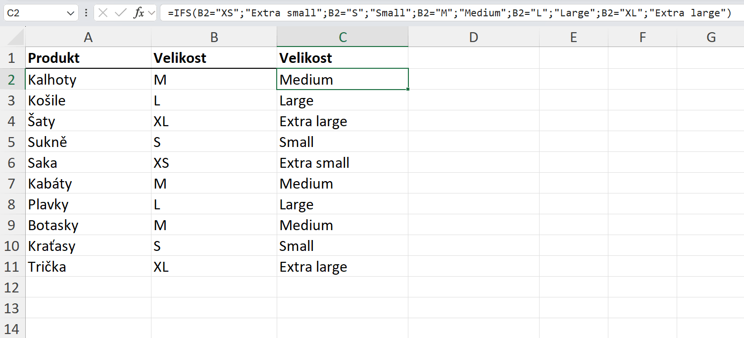 V prvním příkladu máme tabulku s velikostmi produktů. Naším úkolem je do nového sloupce uvést velikosti místo písmen celým názvem. To znamená, že písmeno S reprezentuje velikost Small, písmeno M velikost Medium a písmena XL Extra large atd. Příklad vyřešíme pomocí funkce IFS.