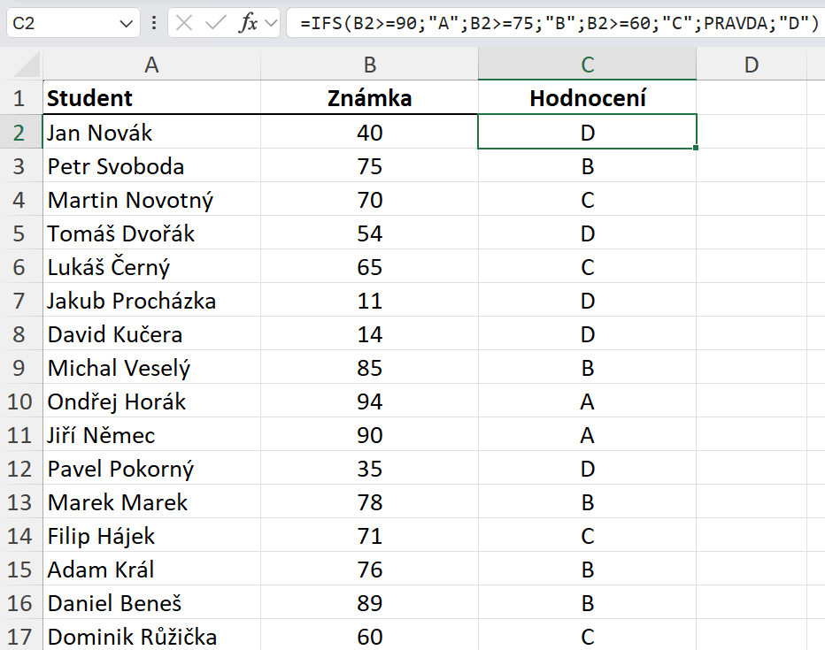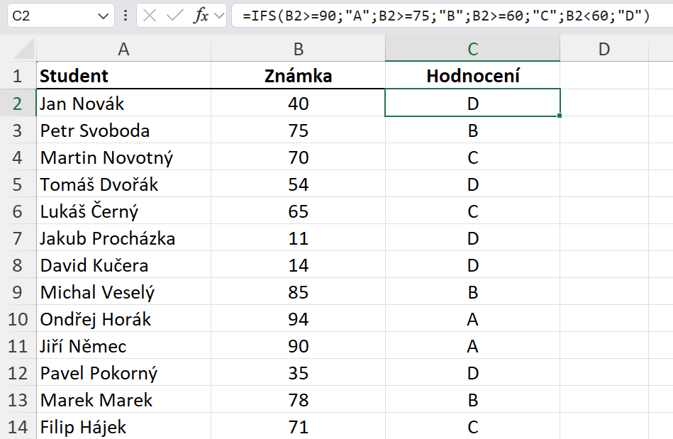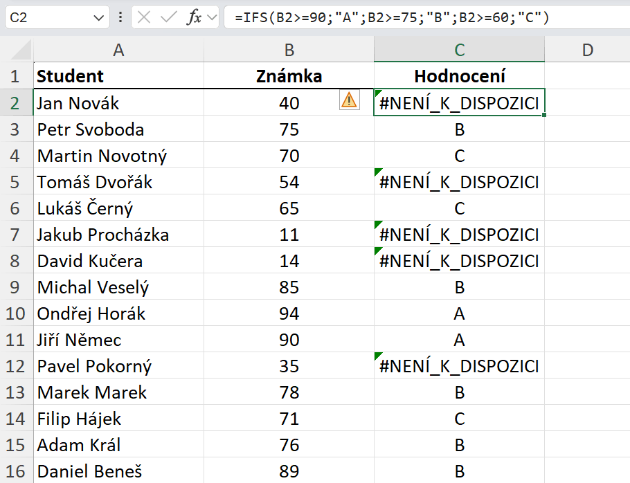 Důvodem chyby je to, že jsme neošetřili všechny podmínky, které mohou nastat a ve funkci IFS nemáme parametr ne, tedy co má nastat, pokud podmínky splněné nebudou. Momentálně nemáme ošetřeno, co se má stát, pokud má student známku nižší než 60 bodů. Excel vyhodnocuje podmínky ve funkci postupně, stejně jako ve funkci KDYŽ. Když tedy funkce narazí na hodnotu, pro kterou nemáme ošetřený logický test, tak vrátí chybu. Chybu lze v tomto příkladu ošetřit dvěma způsoby, můžeme se k funkci vrátit a jednoduše ošetřit i poslední podmínku. Takže bychom dopsali poslední podmínku, kde bychom stanovili, že pro známky menší než 60 se má vrátit hodnocení D.