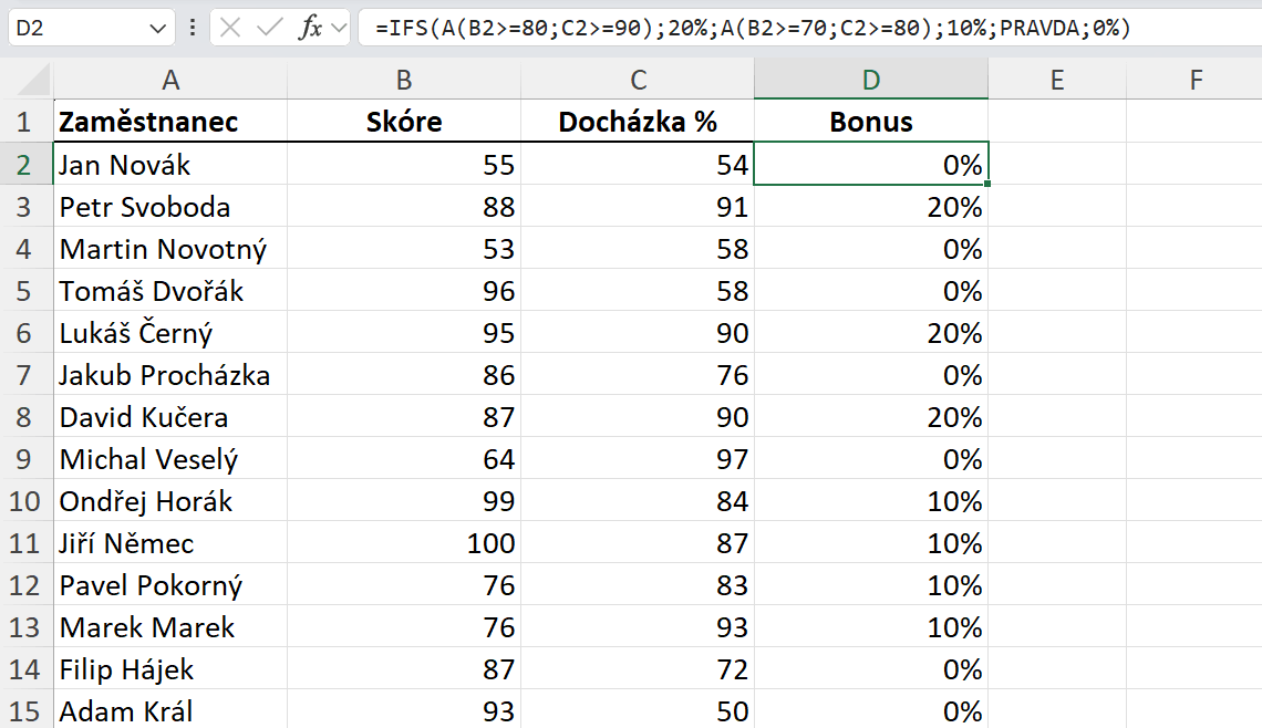 V posledním příkladu potřebujeme ověřit dvě podmínky, které musí platit zároveň. Ve funkci IFS lze používat i logické funkce A a NEBO. Potřebujeme určit, kteří zaměstnanci dostanou bonus, a to na základě následujících podmínek. Pokud je skóre vyšší nebo rovno 80 a docházka je vyšší nebo rovno 90, tak zaměstnanci náleží bonus 20 %. Pokud je skóre alespoň 70 a docházka alespoň 80, tak náleží zaměstnanci bonus 10 %. Ostatní zaměstnanci nemají na bonus nárok.